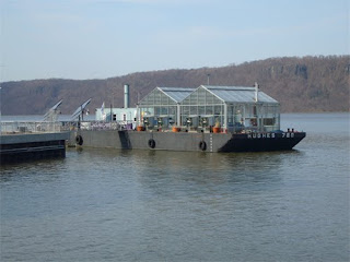 Op zondagochtend lopen we door het Central Park naar Harlem 125 Street en nemen daar de forensentrein naar Yonkers. Vanaf het perron in Yonkers is ons doel, de Science Barge al te zien. De Science Barge is het eerste resultaat van de zoektocht van New York Sunworks naar een duurzame manier om voedsel, zuiver water en energie te produceren, of zoals ze zelf op hun website zeggen “to develop sustainable technologies for the production of food, clean water, and energy, and to raise public awareness of sustainable technology through education projects, seminars, articles, and films”. De Science Barge laat in het klein zien hoe dit moet gaan werken. Deze kas-op-een-ponton heeft drie jaar aan de kade gelegen in Manhattan, en daarna is de kas verplaatst naar Yonkers waar de organisatie Groundworks Hudson Valley het beheert voor educatieve doeleinden. Bob Walters, directeur van de Science Barge, vertelt honderduit over de verschillende systemen, de mensen die komen kijken, over het hydroponics-systeem van Walt Disney in het Epcot Center ( zie ook dit Youtube filmpje) en over de omgeving, en compenseert daarmee het feit dat de hydroponics-systemen nog niet in bedrijf zijn (in de huidige functie loont het niet het systeem tijdens de winter te laten draaien met verwarming).